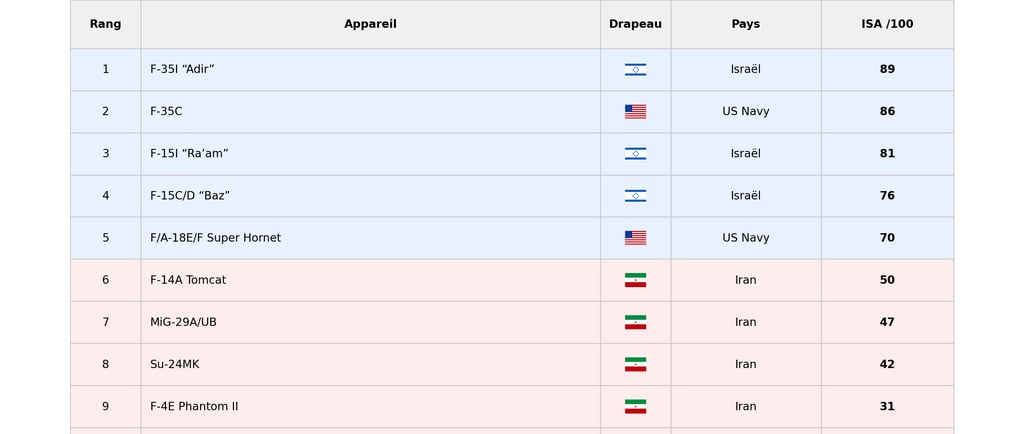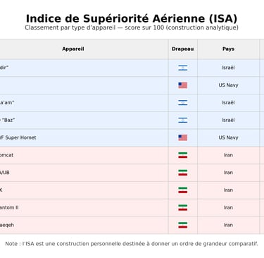 Pour objectiver l’écart, nous avons construit un Indice de Supériorité Aérienne (ISA) présenté en illustration et fondé sur cinq critères : détection, survivabilité, armement, cinématique, intégration système. Les appareils de la coalition dominent systématiquement leurs équivalents iraniens.